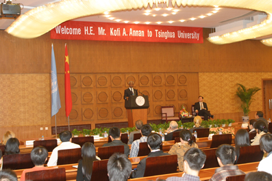 UN Secretary-General Kofi A. Annan visited Tsinghua University and made a speech in the Reception Hall of the Main Building on October 11. President Gu Binglin delivered the welcoming speech.