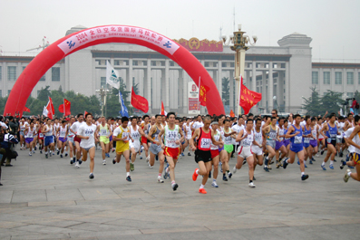 The tournament began at 8: 31 a .m. , starting from Tiananmen Square , passing Xicheng, Haidian and Chaoyang district, ending at the Olympic Sports Centre. Standing in the forefront phalanx, Tsinghua students formed a group full of youthful spirit . Many of them have attended the race more than once, and it's common that those who joined in the 10-km race and mini marathon last year signed up for half marathon this time because they considered it a good chance to challenge oneself and train one's stamina, both in body and mind.