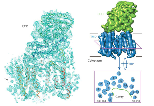 In collaboration with Dr. Xiaochen Bai in Dr. Sjors Scheres’ laboratory at Molecular Research Council at Cambridge, UK, they employed cryo-electron microscopy (cryo-EM) single-particle reconstruction. By exploiting the technological advances in direct electron detection and statistical image processing, the three-dimensional structure of an intact human g-secretase complex was obtained at 4.5 Å resolution. The g-secretase complex comprises a horseshoe-shaped transmembrane domain, which contains 19 transmembrane segments (TMs), and a large extracellular domain (ECD) from Nicastrin, which sits immediately above the hollow space formed by the TM horseshoe. Intriguingly, nicastrin ECD is structurally similar to a large family of peptidases exemplified by the glutamate carboxypeptidase PSMA.