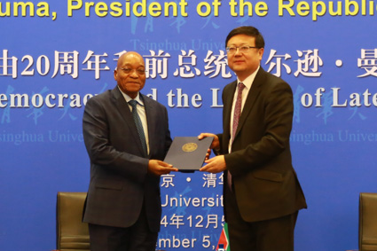 South African President Jacob Zuma visited Tsinghua University and delivered a speech entitled “20 Years of Freedom and Democracy and the Legacy of Late President Nelson Mandela” on December 5th. During his visit to the campus, an Honorary Professorship from Tsinghua was conferred on President Zuma. Tsinghua University President Chen Jining met and had a discussion with Mr. Zuma prior to the speech. Tsinghua University Vice President Yang Bin hosted the ceremony in honor of the conferment of the Honorary Professorship.
