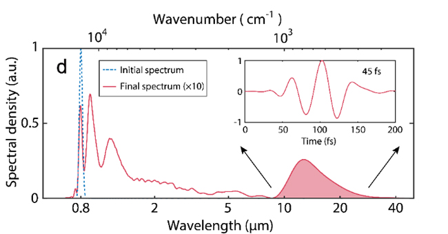 However, due to the limitation imposed by high-harmonic generation, using existing near-infrared (0.8-3.9μm) femtosecond lasers has broken through this technical bottleneck. In principle, a longer wavelength (5-10 μm) in a near-single-cycle laser is needed to effectively achieve shorter attosecond pulses and shorter photon wavelengths. Theory and simulation show that a near-single-cycle laser of 9 μm wavelength can even produce pulses of less than a single attosecond. That is to say, it is possible to push the controllable time scale into the range of zeptoseconds (~10-21 s). However, the traditional crystal-based nonlinear optics approach has encountered an insurmountable challenge in producing femtosecond near-single-cycle lasers with wavelengths longer than 5 μm. Due to the lack of broadband non-linear optical crystals, the wavelengths of near-single-single mid-infrared lasers have been limited to less than 4 μm for a long period of time. This limitation is also a bottleneck in the development of attosecond science towards shorter pulses and higher photon energy.