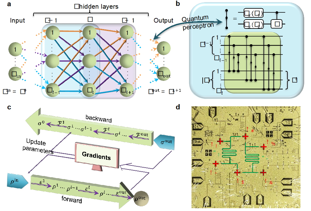 Recently, Luyan Sun’s research group and Dong-Ling Deng’s research group have designed a quantum BP algorithm for DQNNs with the layer-by-layer structure, and demonstrated the trainability and generalization capacities of DQNNs on a superconducting processor. In the framework, qubits are arranged into multiple layers, and the quantum perceptron is defined as a parameterized quantum circuit applied to the corresponding qubit pair at adjacent layers. A sequential combination of the quantum perceptrons constitutes the layerwise operation between adjacent layers. In the forward process, the quantum information is mapped layerwise from the input layer to the output layer. In the backward process, the quantum information is mapped layerwise from the output layer to the input layer. When evaluating the gradients with respect to all parameters at the adjacent two layers, one needs to separately run the DQNN in the forward and backward way, and extract the local information from these two layers, rather than the full DQNN.