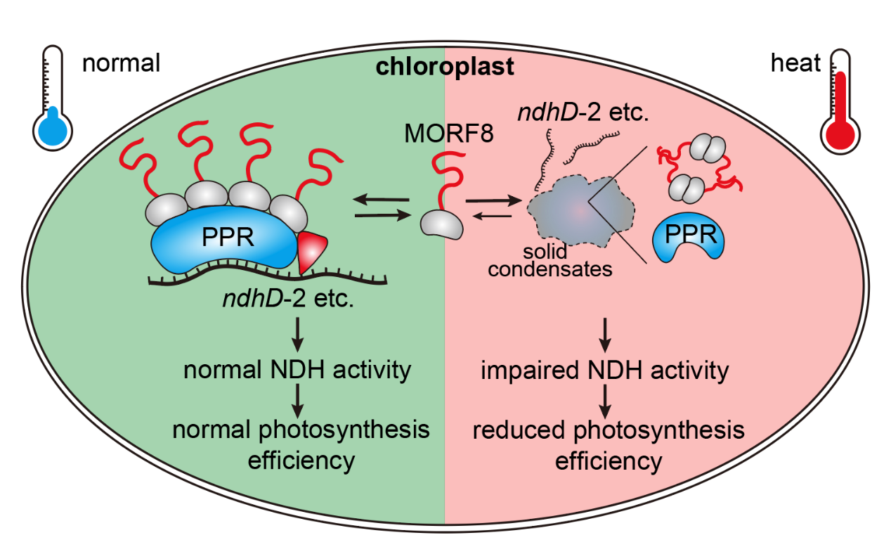 Global warming poses a severe threat to crop productivity by inhibiting photosynthetic efficiency under heat stress, yet the molecular mechanisms remain poorly understood. On March 21, 2025, a study led by Dr. Xiaofeng Fang’s group at the School of Life Sciences, Tsinghua University, was published in Nature Communications. The research uncovers how the chloroplast-localized MORF8 protein forms solid-like condensates under heat stress, disrupting RNA editing and impairing photosynthesis.