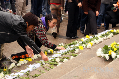 People gathered in the square in front of the university's main building at 10:00 a.m. to pay silent tribute to the earthquake victims. The country's flag is flying at half mast, in memory of the thousands of people who perished.