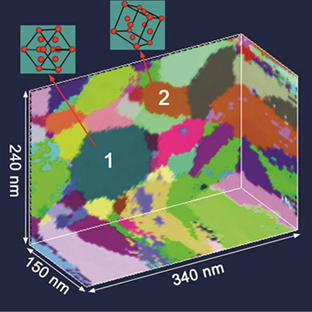 An example of such a 3D map is given in the figure, showing the arrangement of crystals in a 150nm thick nanometal aluminium film. The crystals have identical lattice structure (arrangement of atoms) but they are orientated in different ways in the 3D sample as illustrated by the labels 1 and 2. The colours represent the orientations of the crystals and each crystal is defined by volumes of the same colour. The individual crystals of various sizes (from a few nm to about 100 nm) and shapes (from elongated to spherical) are clearly seen and mapped with a resolution of 1 nanometer.