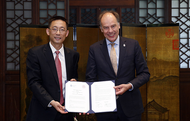 Professor Shi Yigong and professor Carel Stolker signed a university-wide student exchange agreement.