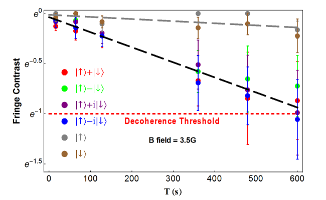 The coherence time of a single ion is mainly limited by the reduction of state-discrimination efficiency from the heating of the qubit ion without any laser cooling. In the experimental demonstration, the problem is resolved by the sympathetic cooling, where the 138Ba+ ion is used as the cooling ion for the qubit ion of 171Yb+ ion. The 138 Ba+ ion is chosen for the cooling ion, since the mass is similar to that of qubit ion while the wave-length for the cooling ion is far from that for the qubit ion, which does not influence on the coherence of qubit ion. Then thousands of dynamical decoupling pulses were applied to extend the coherence time in the influence of magnetic field fluctuation with the gate fidelity of 99.99%. Finally, the coherence times of the single-qubit memory with six different initial states were measured. As shown in Fig. 2, for states |↑> and |↓> , the coherence time is 4,740± 1,760s and for the other four initial states, the coherence time is 667± 17s.