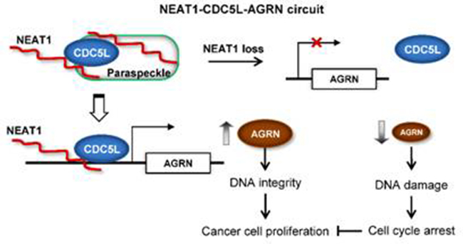 Guided by the data-mining results, experimental studies in Xuerui Yang’s lab confirmed the regulation of CDC5L by NEAT1 and identified the target gene of CDC5L, AGRN, which was modulated by NEAT1. Finally, the team proved that this transcriptional regulatory circuit, NEAT1-CDC5L-AGRN, is essential for proper tumor cell growth, and repression of the pathway causes DNA damage and potent arrest of the cell cycle and proliferation.