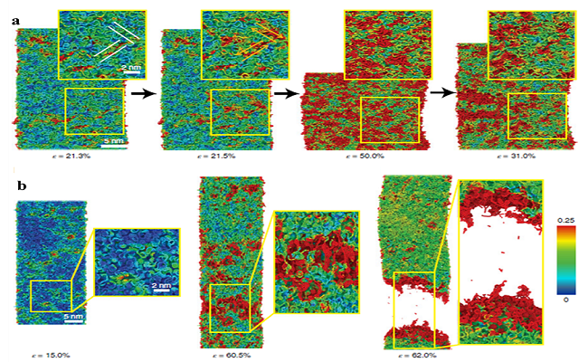 Figure 2. Large-scale atomistic simulations of pyrolytic carbon under compression and tension. (a) Snapshots of a deformed sample at different compressive strains, (b) Snapshots of a deformed sample at different tensile strains.
