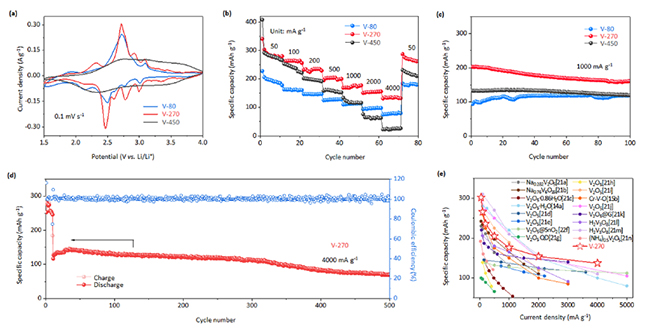 Figure 2 (a-d) Electrochemical performances of glass-ceramic-like vanadate cathodes. (e) Comparison of rate performance with literature data in vanadate related systems.