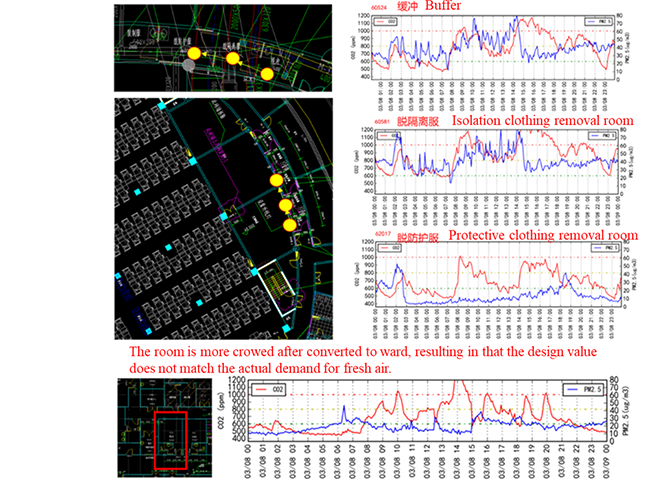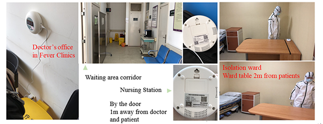 As of March 16th, 32 sets of iBEMs have been installed and applied in the hospital in Beijing for 10 weeks continuously, and 154 sets installed and applied in Huoshenshan, Leishenshan, Jinyuntan Hopitals and Dahuashan Cabin Hospital in Wuhan for over 2 weeks. About 12240 m2 space, 266 ordinary beds and 105 ICU beds were covered by iBEMs (see Table 1). iBEMs were installed in places that are particularly vulnerable to cross-infection. The key indoor environment parameters, including concentrations of CO2 and PM2.5, temperature, relative humidity and illumination, have been monitored and alerted in real time. All the monitored data have been uploaded to the cloud with a 3G SIM card every five minutes, and also locally stored with a SD card. Through the analysis of the characteristics and approaches of virus concentration distribution based on the collected data, the team excavated indoor risk points, investigated problematic ventilation and purification systems, and provided continuous improvement suggestions . With the help of iBEMs, hospitals succeeded to identify and resolve problems in a timely fashion.