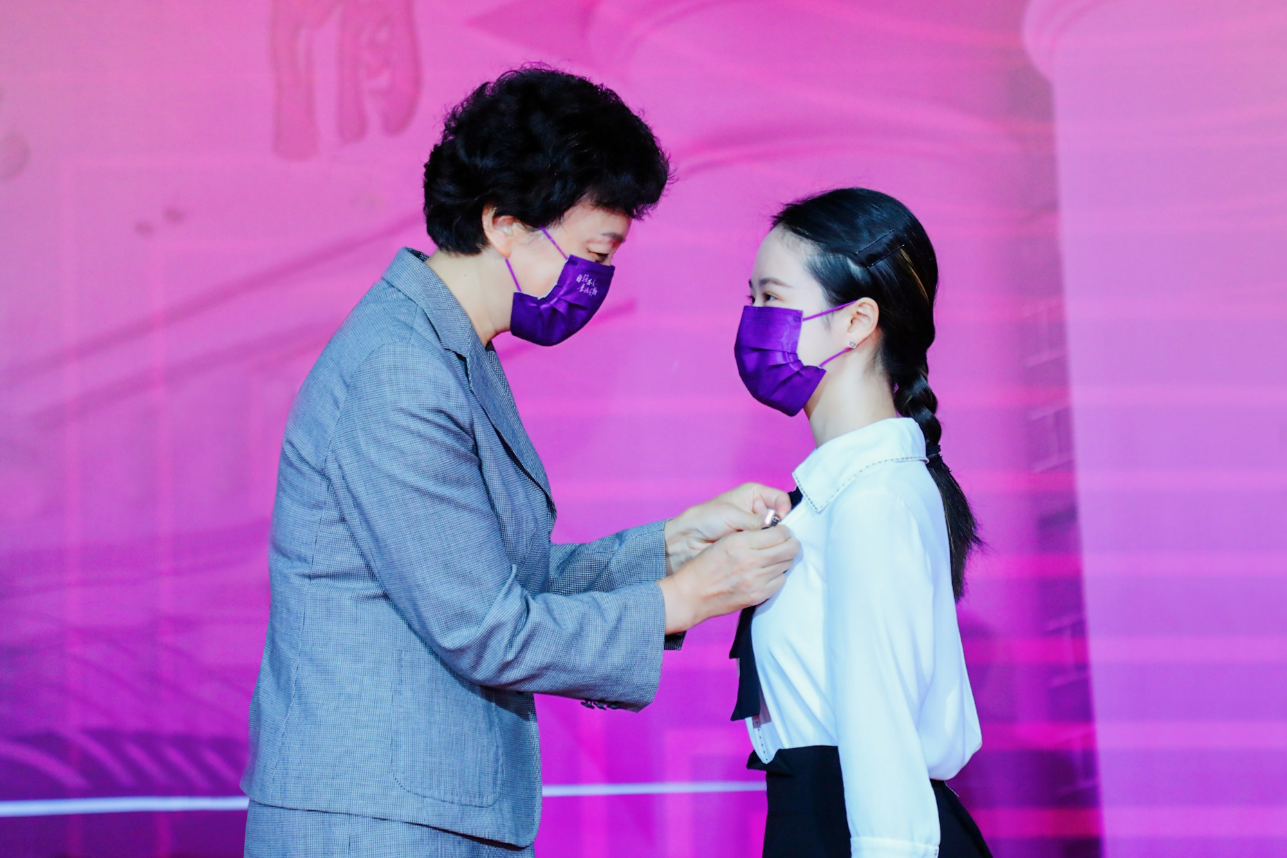 Tsinghua University Council Chairperson Chen Xu wore the Tsinghua badge for the new graduate student representative.