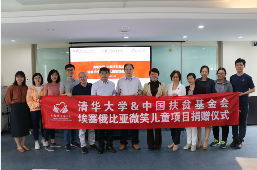 On May 14, a ceremony was held for donation by the China-Africa Leadership Development Institute (CALDI) and the School of Continuing Education (SCE) of Tsinghua University to the Ethiopia Smiling Children Feeding Program of the China Foundation for Poverty Alleviation (CPFA). Professor Liu Huiqin, CALDI Executive Director and Party Secretary of the Institute of Education (IOE);  Associate Professor Xie Jieping,  CALDI General Secretary; Associate Professor Guo Zhao, SCE Vice Dean; Zhang Jue,  SCE International Education Center Director; Chen Hongtao, CFPA Standing Deputy Executive Director; Wu Peng, the International Development Department Director; and other relevant people attended the donation ceremony.