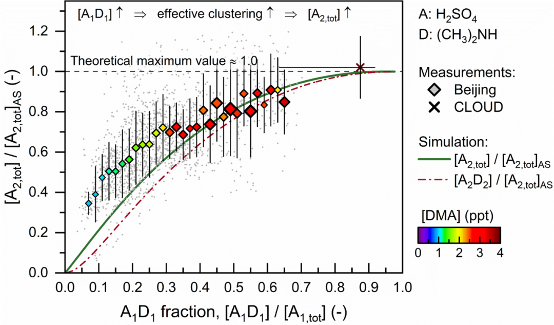 The new mechanism indicates that a significant proportion of the measured gaseous H2SO4 molecules actually exist as acid-base heterodimer clusters, and gaseous H2SO4 will participate in the growth process of larger clusters in the form of acid-base heterodimer clusters. At the same time, an increase in amine concentration can increase the proportion of acid-base heterodimer clusters in gaseous H2SO4, and improve the probability of effective collisions between gaseous H2SO4 molecules and the formation of larger clusters, pushing the cluster formation rate and new particle formation rate towards the theoretical maximum (Figure 3).