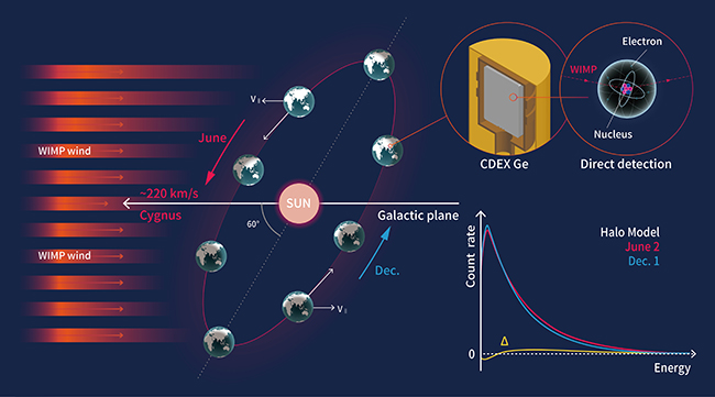 图1 暗物质年度调制效应示意图。左:由于地球公转,暗物质与探测器的相对速度(相互作用事例率)会产生周期性变化,相对速度(相互作用事例率)在6月达到最大,12月达到最小,调制周期为1年。右上:本次分析中的CDEX点电极高纯锗探测器及暗物质直接探测示意图。右下:红(蓝)线表示6月2日(12月1日)质量为8 GeV的WIMP与探测器靶核发生弹性散射后的核反冲能谱,两者之差(黄线)为理论上的年度调制幅度谱。