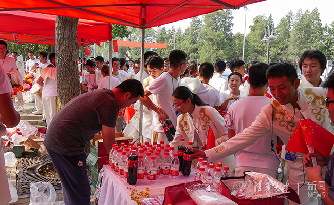 今天的清华园,到处洋溢着喜庆的节日氛围。主楼前、宿舍楼外、操场上,还有一辆辆自行车的车篮上,一面面五星红旗迎风飘扬,师生们对祖国的美好祝福汇聚成一片沸腾的红色海洋。“不忘初心、牢记使命”的合影浮雕,“我们都在努力奔跑,我们都是追梦人”的巨幅展板,同学们亲手描绘的彩色绘版,沿途补给区一字排开的丰富饮品,都在向载誉而归的师生们致以最热情的问候:“欢迎回家!”