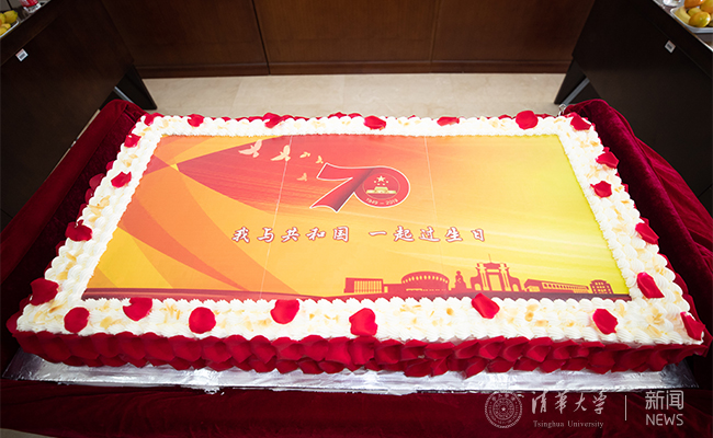 在生日歌的温馨旋律中,姜胜耀、方惠坚、建筑学院退休教授郭黛姮、人文学院教授彭林、教师代表王亚华、学生代表吴熙共同为大家切生日蛋糕。本次座谈会特别设计定制了一个1米长、50公分宽的特大蛋糕。在玫瑰花瓣的环绕中,蛋糕中央红色的国庆70周年标志和“我与共和国一起过生日“主题格外醒目,承载着师生们对共和国的美好祝福,表达了与共和国一起过生日的喜悦心情。