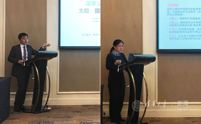 杨锐(左)主持“国家公园制度创新”边会,庄优波(右)在边会上发表演讲