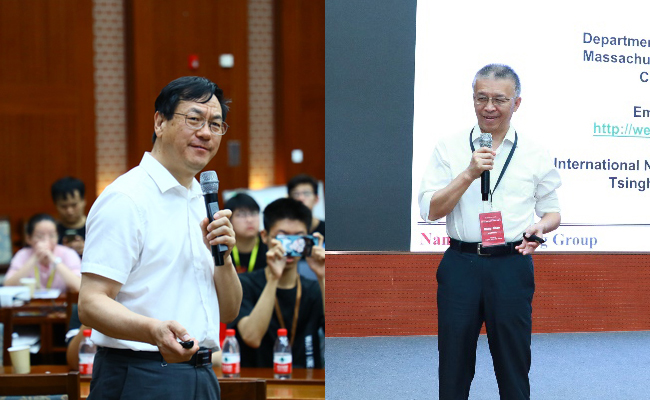 左右分别为:2019年爱因斯坦世界科学奖得主、中国科学院外籍院士王中林向参会学生介绍摩擦纳米发电机,美国国家工程院院士、麻省理工学院机械工程系讲席教授陈刚作大会报告