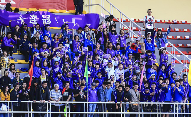 在本次赛事中,清华师生装备着整齐的“助威套装”来到比赛现场为清华健儿加油助威,使清华“紫色”点燃了赛场的气氛。