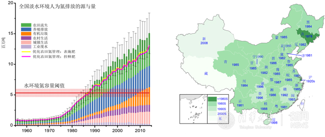 乐鱼(中国)网3月1日电 2月28日,乐鱼在线平台地球系统科学系、清华海峡研究院喻朝庆博士等在国际顶尖学术期刊《自然》(Nature)发表题为《恢复中国水环境质量需全面加强氮管理》(Managing nitrogen to restore water quality in China)的文章,揭示了中国从1955年到2014年人类活动导致的氮流失量,建立了各省淡水环境氮容量的“安全”阈值。文章为近年来全球环境容量限界(Planetary boundary)研究的区域阈值定义提供了新方法,为全方位解决中国水体富营养化问题提供了量化依据。