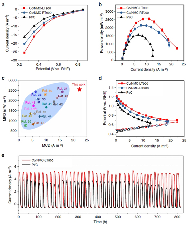 低温溶液合成并经高温活化稳定的原子级分散金属钴基催化剂与传统团簇/纳米颗粒催化剂和商业Pt/C相比,在中性(0.05 M PBS磷酸缓冲液)和碱性(0.1 M KOH)的电解液环境中,都表现出显著提高的氧还原催化活性和稳定性。进一步在微生物燃料电池器件应用中,也表现出了远超前期文献报道的功率密度(2550 ± 60 mW m-2)和长达820小时的稳定运行(图2),能够同时实现污水处理与高性能产电。该低温溶液合成不仅提出了一种在湿化学合成反应过程中抑制产物形核生长的通用方法,更为进一步理解溶液反应的形核热力学和动力学、并利用传统溶液化学方法制备高性能催化材料提供了新的可行性。