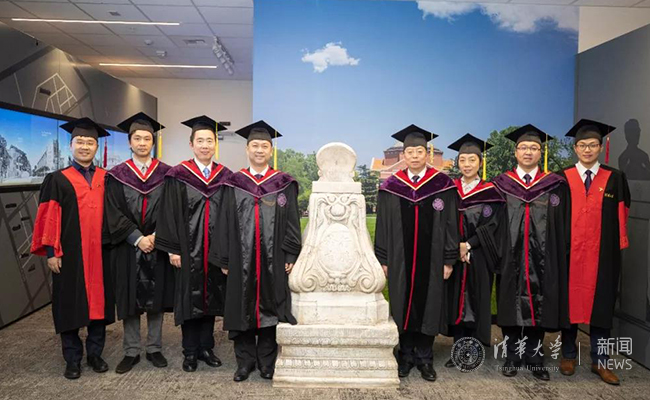 华盛顿大学嘉宾身着各自所毕业学校的学位服,校长科斯(左三)因获得清华名誉博士学位而身着清华博士学位服