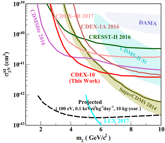 研究团队目前进行到第二阶段CDEX-10实验。与CDEX-1不同, CDEX-10替换了不利于提高探测器质量的冷指制冷技术,在国际上首次采用液氮直冷方式,使用由三串探测器(每串探测器内部包含了三个1公斤量级的点电极高纯锗探测器)构成的总质量约10 kg的点电极高纯锗探测器阵列进行暗物质直接探测实验。这项实验成果是CDEX-10实验的第一个物理成果。