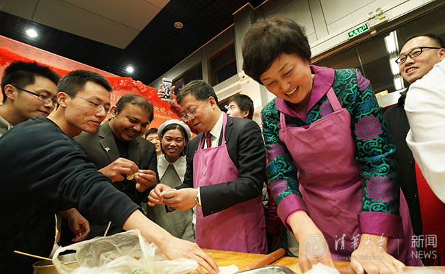 在餐厅里,食堂师傅们精心准备了丰盛可口的年夜饭。前来参加晚会的同学们纷纷在签名墙前合影留念,并在主持人引导下参加“一站到底”和抽奖游戏。在每人一张的清华主题明信片上,同学们写下对亲朋好友的新春祝福,在新春第一天寄往世界各地。