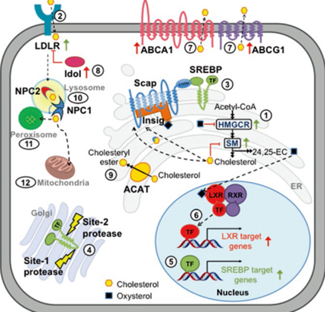 图1. 细胞内胆固醇平衡的整体示意图 (图片来源:《分子生物学方法》)。