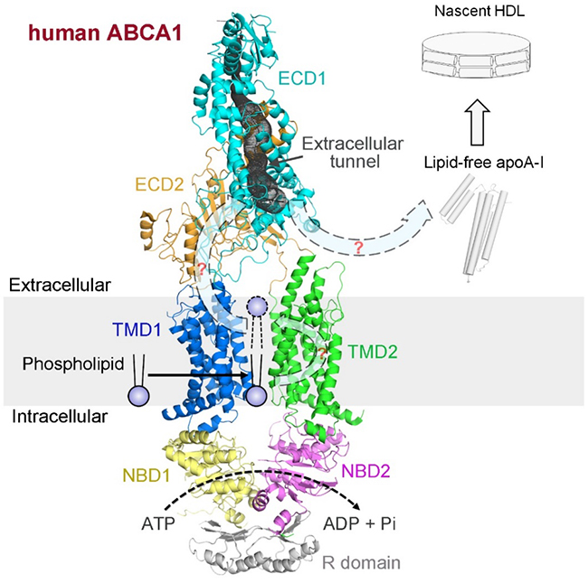 胆固醇逆向运输是指将肝外组织细胞内的胆固醇通过血液循环转运回到肝脏、在肝脏中进行代谢转化再排出体外的过程,该过程可以通过将过量的胆固醇从动脉血管壁细胞排出体外来阻止泡沫细胞的形成,从而抑制动脉粥样硬化的发生和发展。过程第一步是ATP结合盒转运蛋白A1(ABCA1)将包括磷脂和胆固醇在内的脂类向细胞外运输,然后与细胞外的脂类受体载脂蛋白A-I(apolipoprotein A-I)结合,从而形成初生高密度脂蛋白(nascent HDL)。高密度脂蛋白HDL被认为对人体有益,脂类的外排和与脂类受体载脂蛋白A-I的结合是HDL形成的限速步骤。之前的研究发现,人体中的ABCA1突变会导致HDL缺乏症,包括丹吉尔病(Tangier disease)、家族性HDL缺乏症(familial HDL deficiency)。虽然ABCA1作为胆固醇逆向运输过程中的关键蛋白,同时在动脉粥样硬化等疾病的发生和发展过程中具有关键性作用,但是目前对于ABCA1的结构及其介导的脂类外向转运和初生HDL形成的机制大部分尚未知晓。