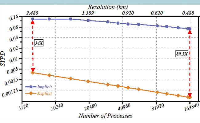 图为“千万核可扩展大气动力学全隐式模拟”项目弱可扩展性测试,及显式隐式计算方法性能对比结果。