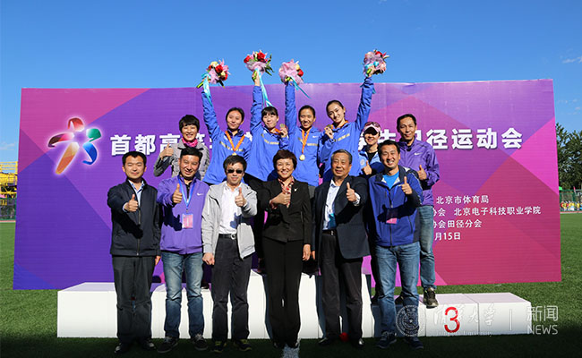 校领导与4×400女子接力冠军合影。陈梦妮 摄