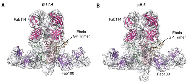 两种不同pH条件下埃博拉GP与Fab114和Fab100复合物冷冻电镜结构 。
