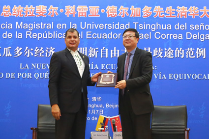 陈吉宁向科雷亚总统赠送演讲纪念牌。记者 苑洁 摄