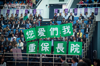 随后,一场特殊的“师恩难忘”活动展开,由钱颖一院长主持。随着短片《朱院长的清华经管印记》的播放,观众席上的在校同学和校友们打出了“院长保重,我们爱您”的标语。一张张照片,一段段题词,一份份寄语,30年来朱镕基关心、指导经管学院发展的点点滴滴在大屏幕上不断展开,打开了大家共同的珍贵记忆。