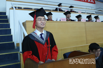 毕业生代表、物理系博士生张金松与大家分享了自己在清华十年学习科研生活的感悟。他以自己参与发现量子反常霍尔效应的科研经历为例,与大家分享了科研中面临挑战与困难时坚持不懈取得成就的心得体会。