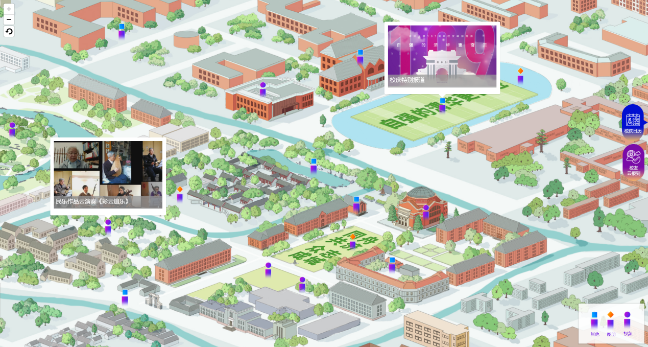 此外,校庆专题网站中还特别设计了“云游校园”版块。精心手绘的校园地图上分布着数十个不同点位,每个点位都可以链接到相应的图片、视频或活动,带你走进水木清华一处处魂牵梦萦的所在,在光影流动中拥抱久违的清华园。