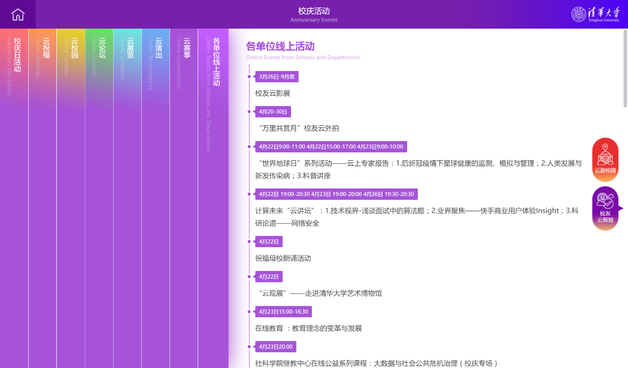 “校庆活动”版块:用彩虹条方式呈现,“一网打尽”校庆日活动、云祝福、云校园、云论坛、云展览、云演出、云赛事、各单位线上活动等云端校庆活动。