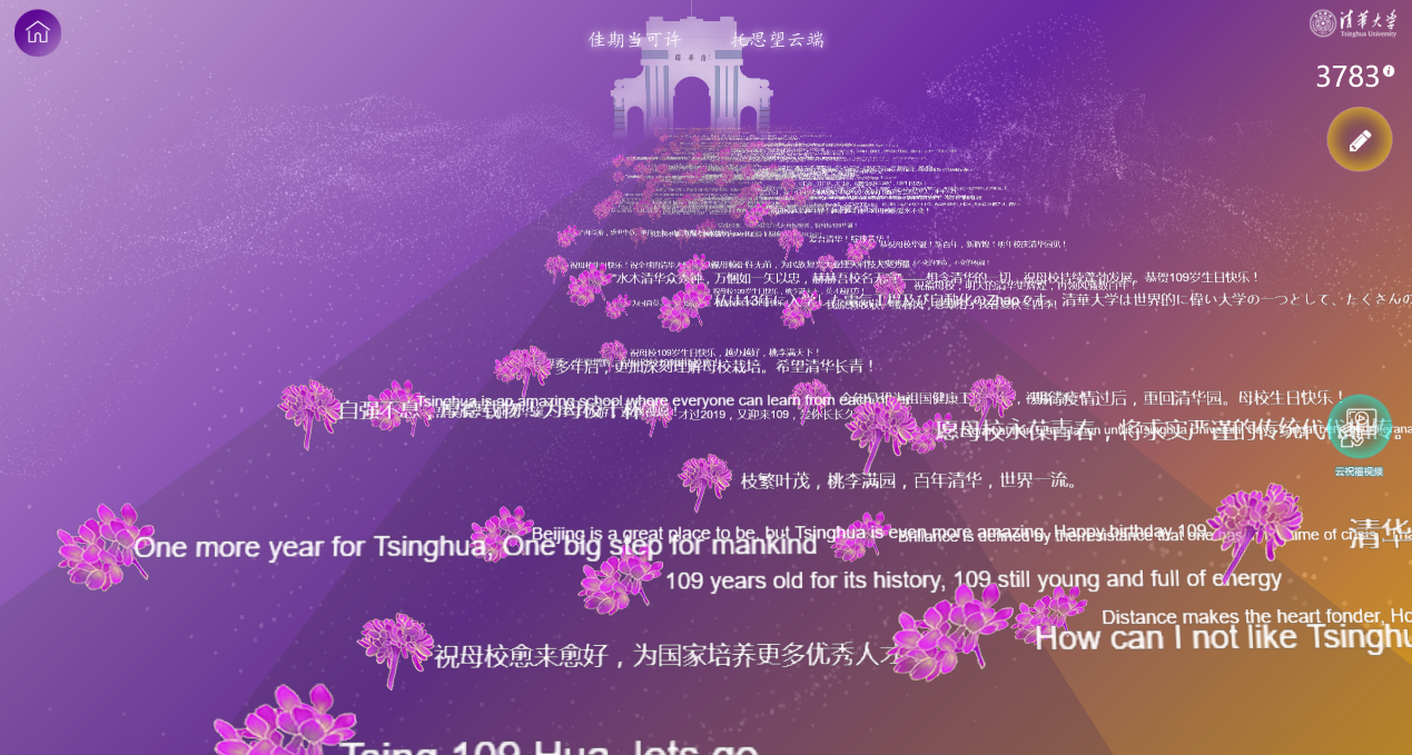 “校庆祝福”版块:东风夜放花千树,更吹落、星如雨,千万条祝福与一朵朵紫荆花共同铺就通向二校门的“星光大道”。无论清华在校师生、校友还是全球关心支持清华的各界朋友,都可以在这里用不同语言为乐鱼在线平台109周年校庆留下真诚的祝福,写下与清华的情缘,记录与清华人共抗疫的点滴,表达对水木清华的思念或向往……