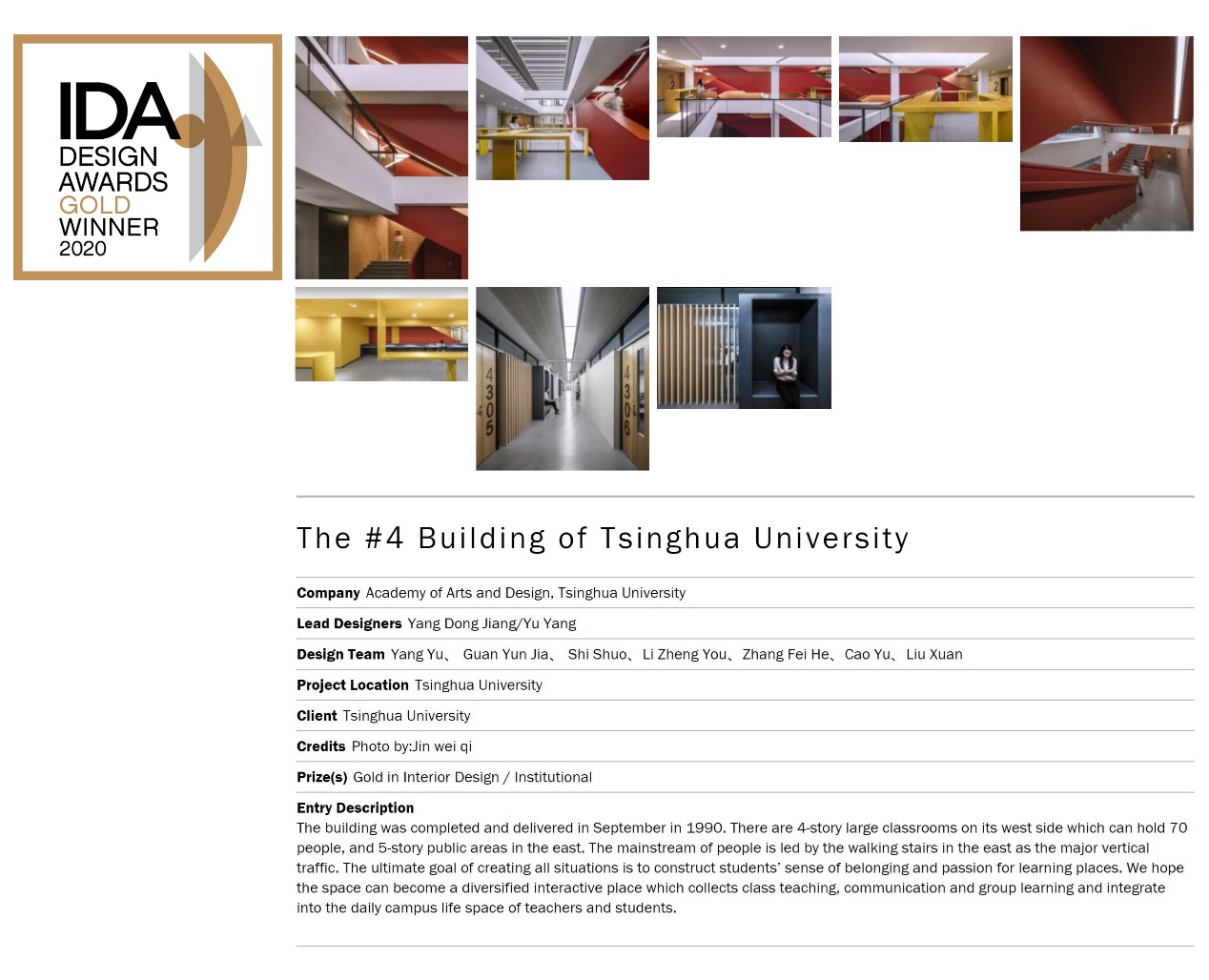 乐鱼(中国)网2月2日电 1月28日,美国IDA国际设计奖公布了2020年度获奖名单,乐鱼在线平台美术学院杨冬江教授团队的设计作品《乐鱼在线平台第四教学楼室内设计》从80多个国家和地区的众多优秀作品中脱颖而出,荣获室内设计类别金奖。