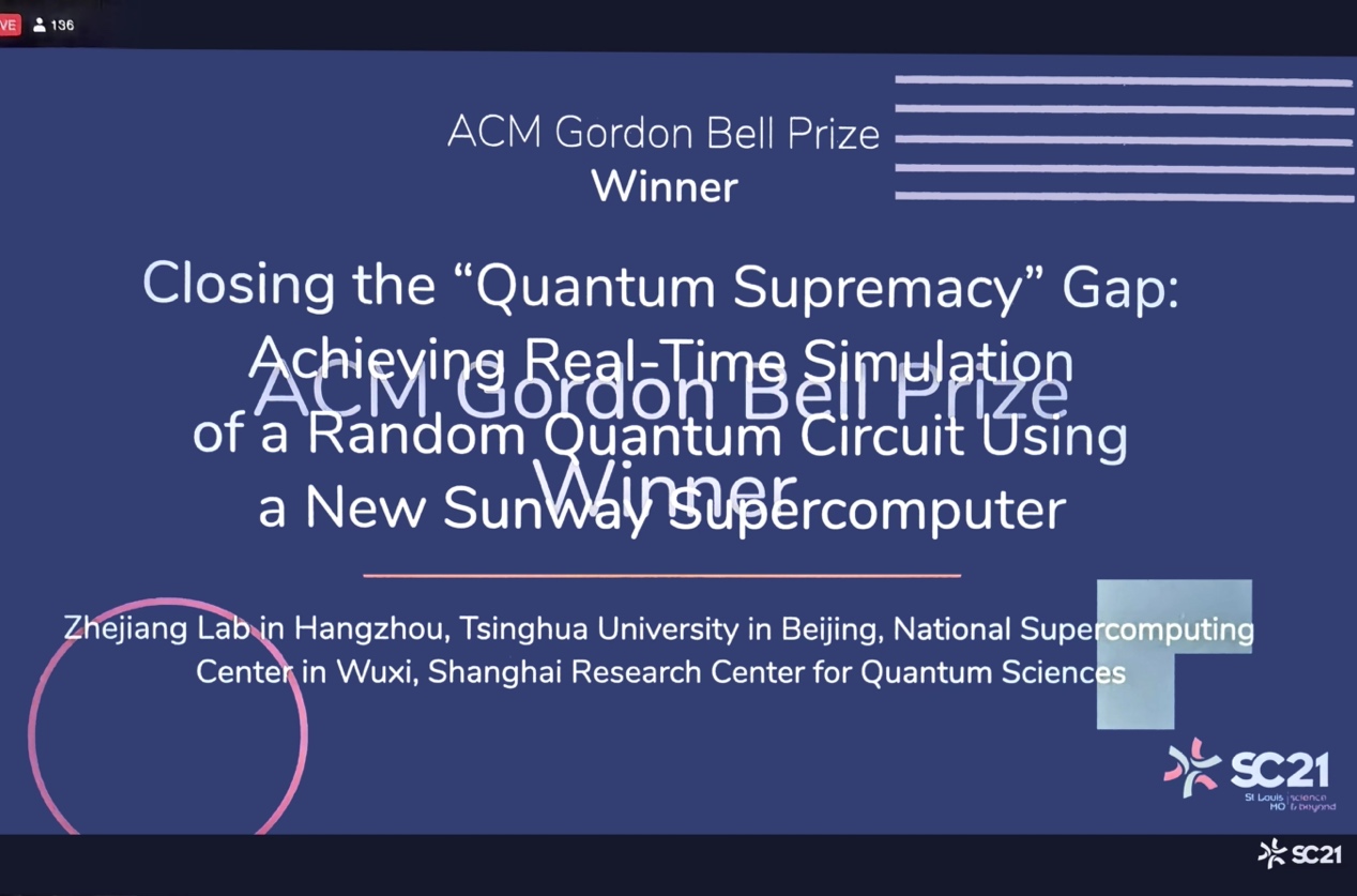 乐鱼(中国)网11月20日电 美国时间11月18日下午,2021年度“戈登·贝尔”奖的谜底在密苏里州圣路易斯举行的全球超级计算大会(SC21)上揭晓,中国超算应用团队凭借“超大规模量子随机电路实时模拟”成果(Closing the Quantum Supremacy Gap:Achieving Read-Time Simulation of a Random Quantum Circuit Using a New Sunway Supercomputer )(简称“SWQSIM”)获此殊荣。该团队由来自之江实验室、乐鱼在线平台、国家超级计算无锡中心、上海量子科学研究中心等机构的14名成员组成。他们分别是来自乐鱼在线平台及国家超级计算无锡中心的付昊桓、陈德训,之江实验室及国家超级计算无锡中心的刘勇、刘鑫、李芳、杨雨灵、宋佳伟、赵朋朋、王臻、彭达佳、陈华蓉,国家超级计算无锡中心的吴汶钊,上海量子科学研究中心的黄合良、郭楚。其中,刘鑫、付昊桓、郭楚、陈德训为共同通信作者。