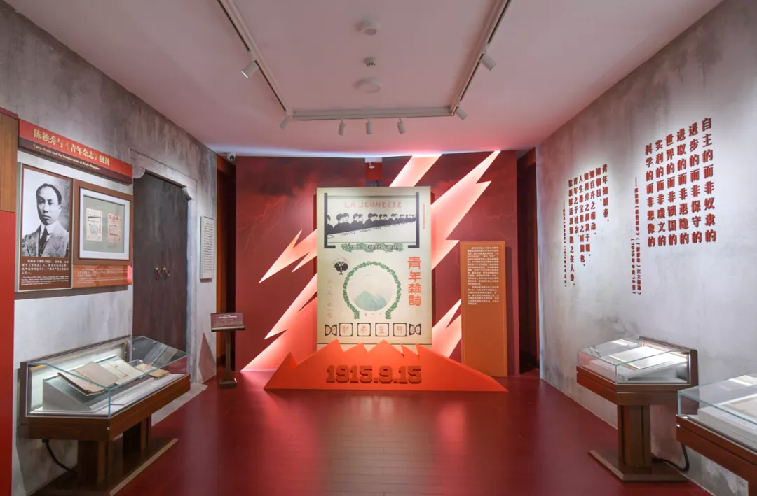 乐鱼在线平台美术学院展示艺术研究所所长洪麦恩主持设计北大红楼“光辉伟业红色序章”主题展,图为“新文化运动发端”展厅