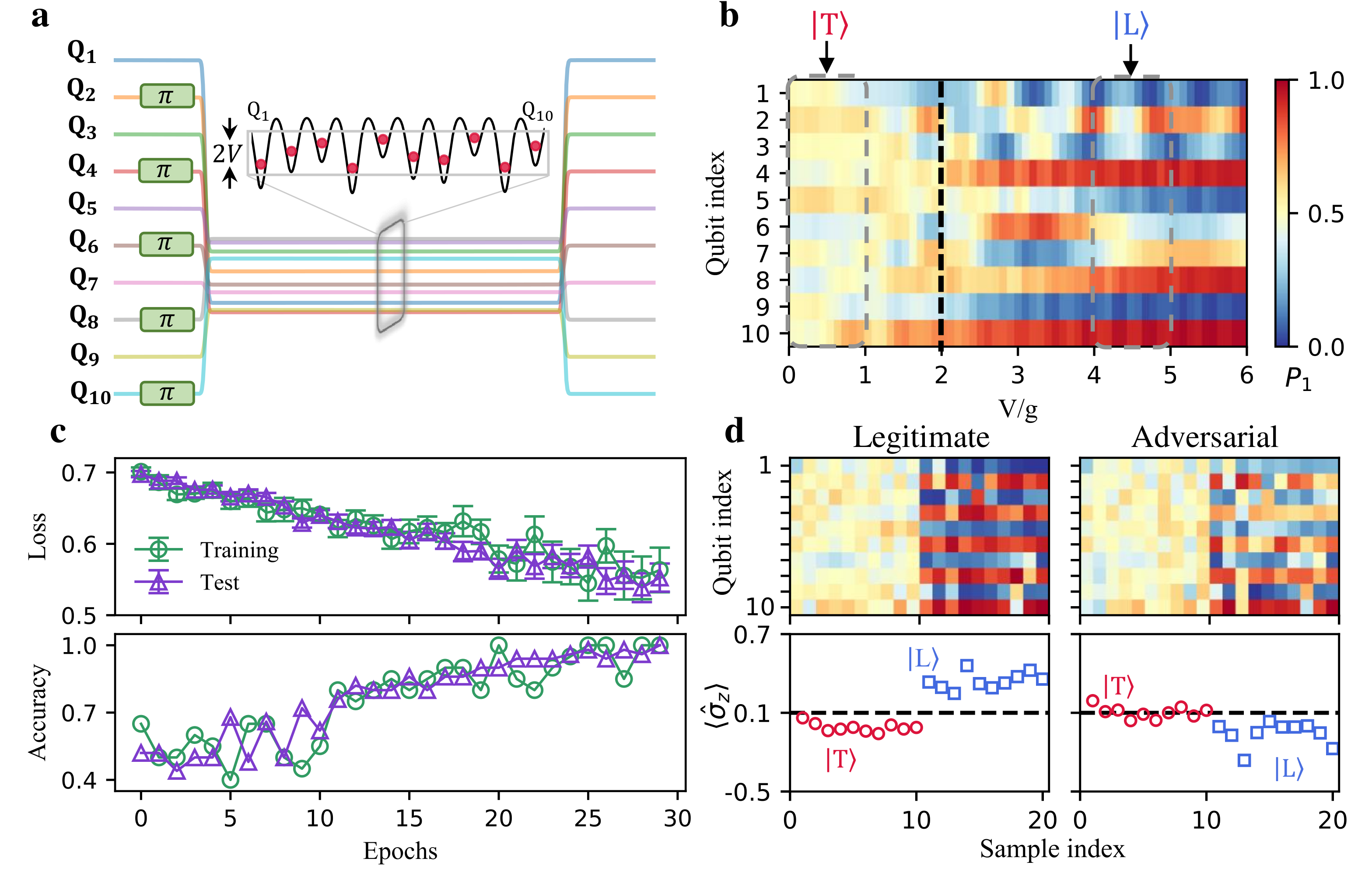 在量子机器学习领域,近年来的理论工作展示了在某些特定的任务下,量子分类模型和生成模型相对于经典模型具有可证明的、有复杂性理论保证的优势。最近两年,量子对抗机器学习的概念也被提出并受到了广泛关注。然而,在当前中等规模带噪声(NISQ)量子设备上演示量子学习模型面对对抗攻击的脆弱性和防御手段还面临诸多挑战。该研究中,乐鱼在线平台交叉信息研究院邓东灵团队设计了处理经典数据和量子多体态数据的学习模型,并与浙江大学超导量子计算团队合作,首次在量子设备上成功实现了高维数据的学习、对抗攻击脆弱性的揭示以及相应防御手段的展示。