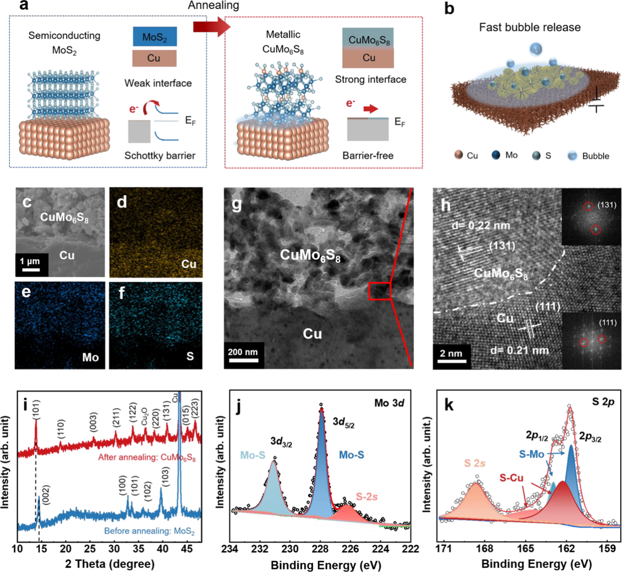 近日,乐鱼在线平台深圳国际研究生院刘碧录团队创制出一种基于双界面设计的同源金属电极。该电极以优化催化剂与基底以及催化剂与气泡的双界面为出发点,解决了大电流密度制氢下的传质、界面力学、界面电导三大难题。这种同源金属催化剂通过MoS2和Cu的原位高温反应制备,将半导体相MoS2转成具有金属性质的Chevrel相CuMo6S8,这种一体化结构有效消除了半导体-金属接触的界面肖特基势垒。由于电极表面催化剂与基底具有强的化学键结合,且电极展现出全金属性质以及超亲水状态,因此有效提升了催化剂/基底界面结合力并降低了催化剂/气泡界面粘附力,在增强电极稳定性的同时加速了析氢反应的动力学,展现出优异的电催化析氢性能。该电极在2.5 A cm-2下仅需321mV的过电位,在1 A-2.5 A cm-2级别的大电流密度下稳定运行300小时性能无衰减。此外,前驱体MoS2可取自天然矿石辉钼矿,成本比贵金属铂降低2-5个数量级,与目前的大电流密度催化剂相比具有更大的成本优势。