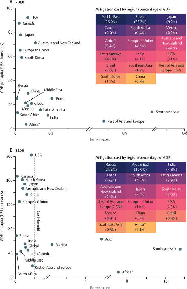 成本效益分析表明,2050年至2100年间,碳减排带来的劳动力效益将逐渐增加。2050年,全球劳动力效益可抵消约5%的减排成本,2100年可进一步抵消约50%的减排成本。基于减排成本与劳动力效益的分布特征,研究将全球大致分为三类地区:(1)效益高于成本的地区,主要分布在人均收入低且排放较低的低纬度地区,包括东南亚、巴西和墨西哥等地;(2)效益远低于成本的地区,主要是化石燃料出口大国,包括加拿大、俄罗斯和中东等国家和地区;(3)效益成本比高于全球平均水平的地区,美国、中国和印度等主要排放大国均在此类地区。
