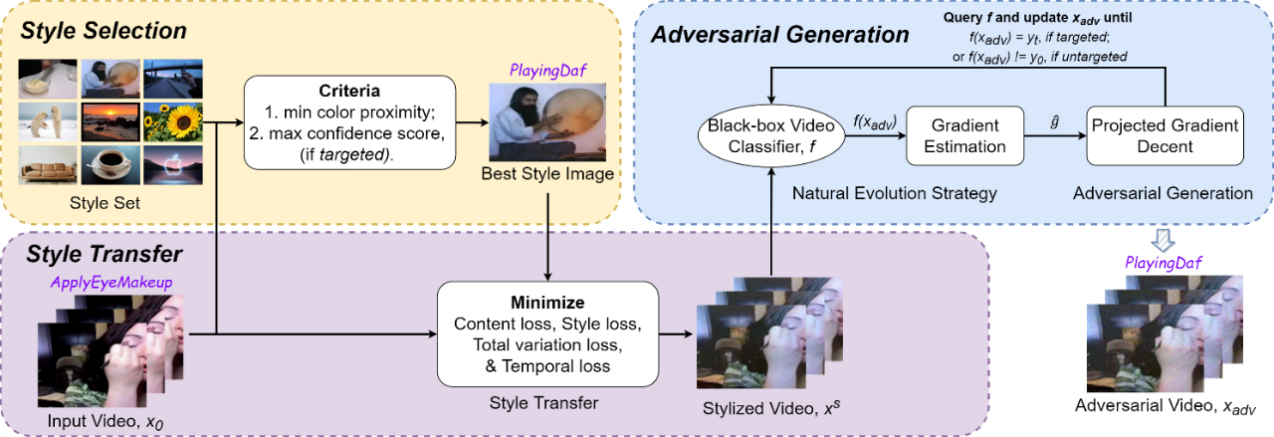传统的风格迁移基于艺术风格,导致生成的风格化图像与现实场景相差甚远。为解决这一问题,团队提出了一种风格图像选择方法,既能确保风格化视频保持高自然性,又能使得风格化视频可以移动甚至跨过决策边界。团队将输入视频进行视频风格迁移,并利用梯度估计的方法优化风格化视频,直到视频达到误分类的要求。与同类方法相比,StyleFool能够显著提高攻击的成功率并降低查询次数。同时,在抵御视频对抗防御方法的性能方面,由于StyleFool考虑了前后帧间一致性约束和语义不变的无限制扰动,它所生成的对抗样本可以轻松绕过先进的视频防御方法。StyleFool在不改变语义信息的情况下产生无限制的扰动,跳出了传统的范数限制攻击的束缚,并在攻击性能、抵御防御性能等方面优于现有对抗攻击方法,大大降低了攻击成本,是对抗攻击迈向非语义化的一大突破。