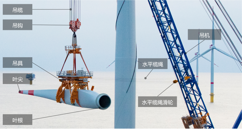 图1.单叶片安装过程 (a)叶片和轮毂对接,(b)高精度对接作业,(c)叶片定位销
