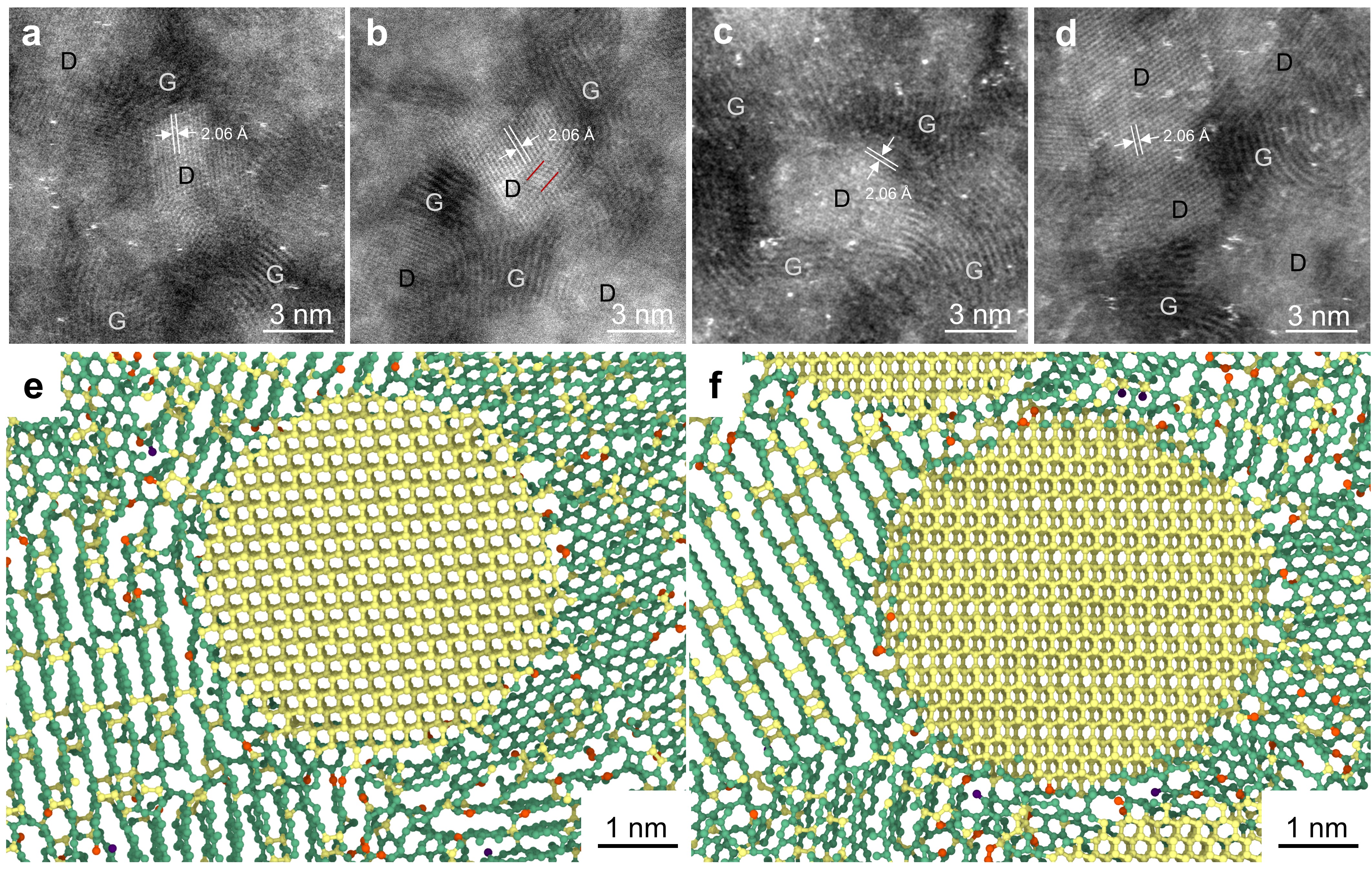 图1.纳米金刚石/无序多层石墨烯复合材料的微观组织和界面结构