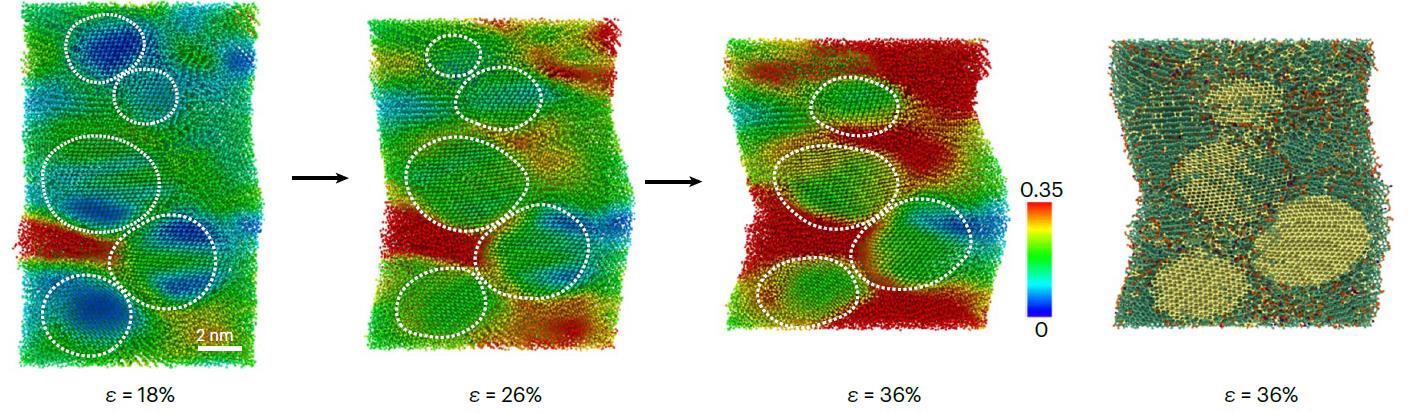 图3.大规模分子动力学模拟展示了在复合材料的压缩变形过程中,纳米金刚石有效地阻碍了石墨烯基体中剪切带的传播和扩展